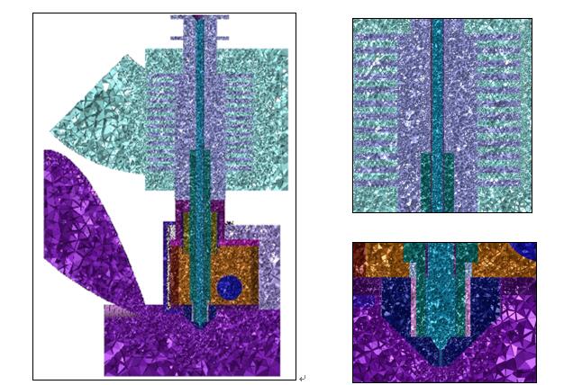 -上部散熱結構及風扇附近的強制對流(例如圖2中青色與紫色網格區域)。考慮到計算成本和結果精確度,此次仿真重點考慮這兩處流體區域對溫度分布的影響。